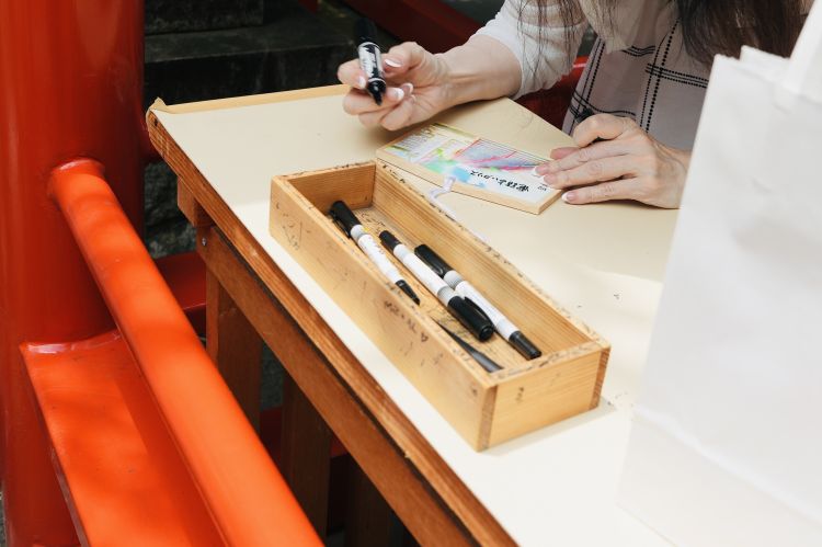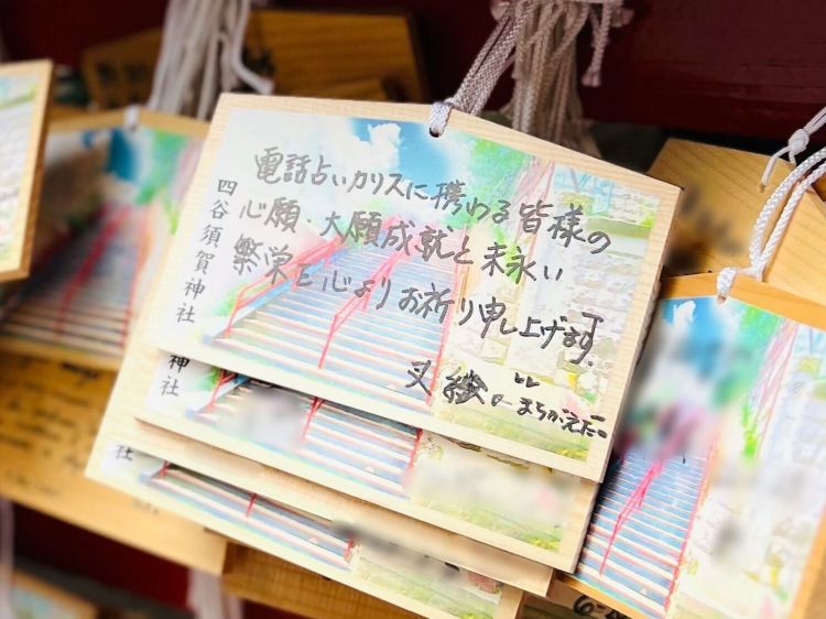 また、須賀神社では、階段の絵が描かれた魅力的な絵馬があり、叉紗(サシャ)先生に願いをご記入いただきました!