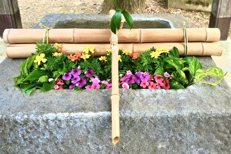 手水舎には色とりどりのお花があり、身も心も浄化される空間となっておりました。