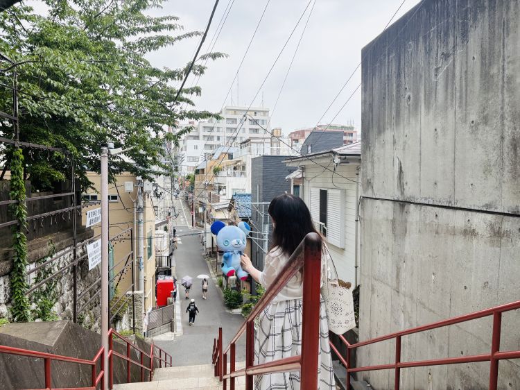 階段では、叉紗(サシャ)先生とあおいくまくんが名シーンを再現してみました。