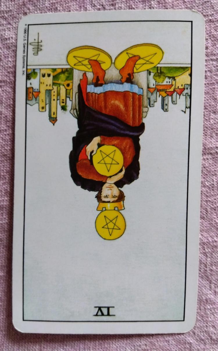 「ペンタクルの4」の逆位置。