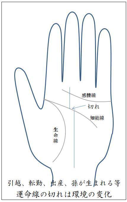 運命線に出る切れは運命が切り替わる時期です。という事は環境の変化があるのです。