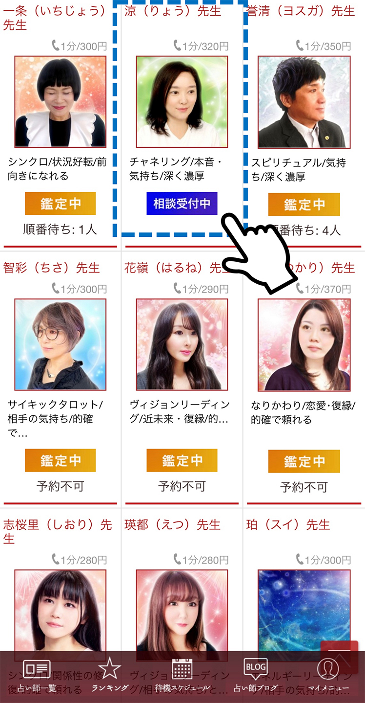 【占い師一覧】ページからご希望の占い師をクリックタップしてください。