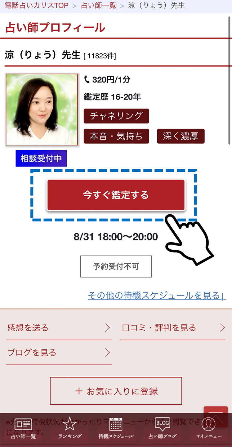 【占い師プロフィール】ページから今すぐ鑑定するをクリックタップをしてください。