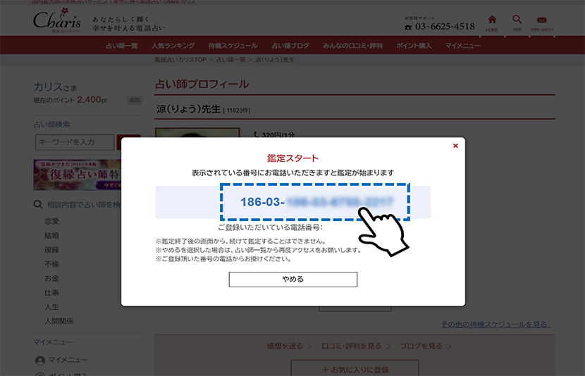 鑑定番号が表示されますので、そのままお電話をおかけいただくことで、占い師と繋がります。