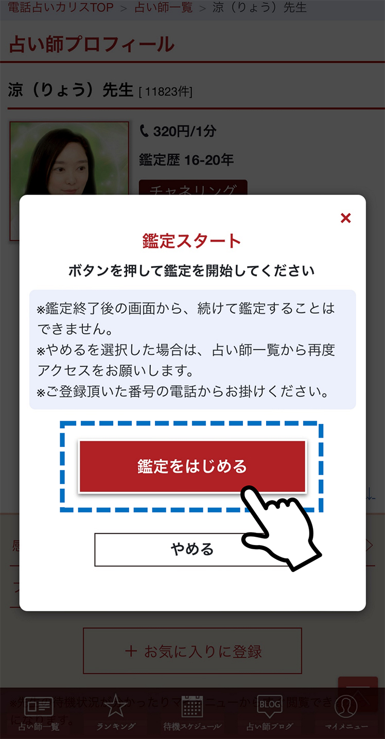 【鑑定をはじめる】ボタンを押すことで占い師に繋がる番号に発信することができます。ガイダンスが流れますのでそのままお待ちください。